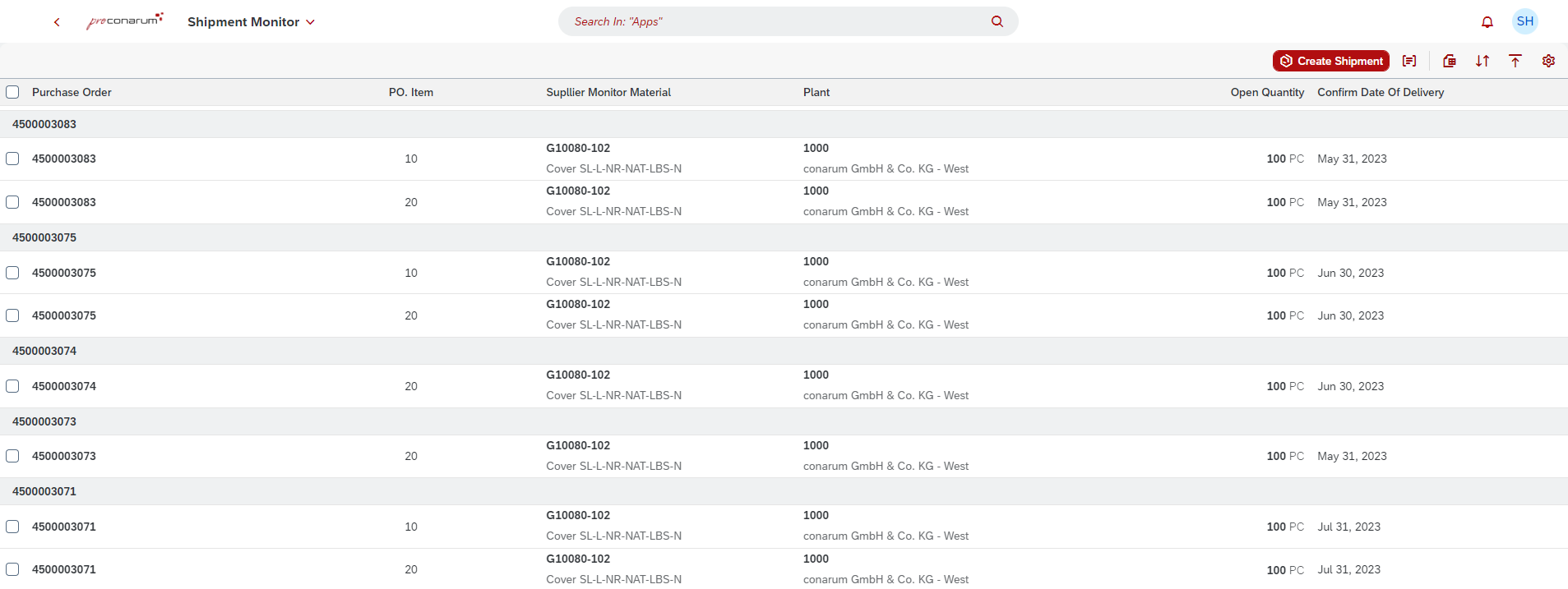 The supplier uses the shipment monitor app to select purchase documents items which shall be delivered in a selected period or for a specific customer plant.