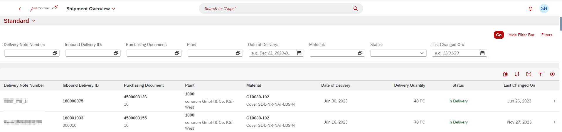 The object overview page offers different filter fields and several information about a shipment notification.