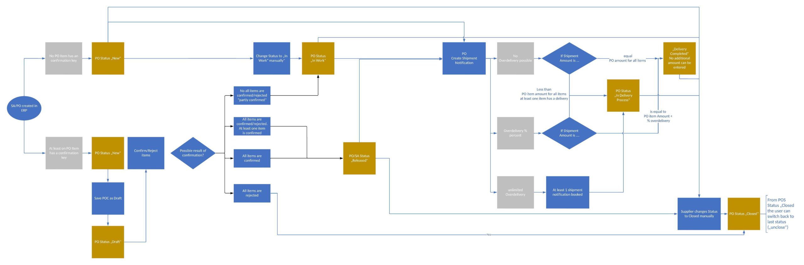 In case the purchasing document does not expect a confirmation, the supplier can set the status In Work to organize his work better. Also partly confirmed purchase orders get the status In Work.
