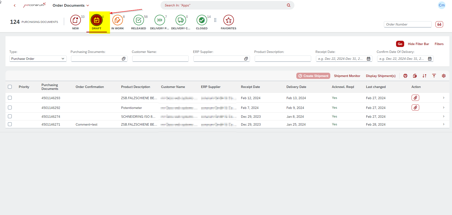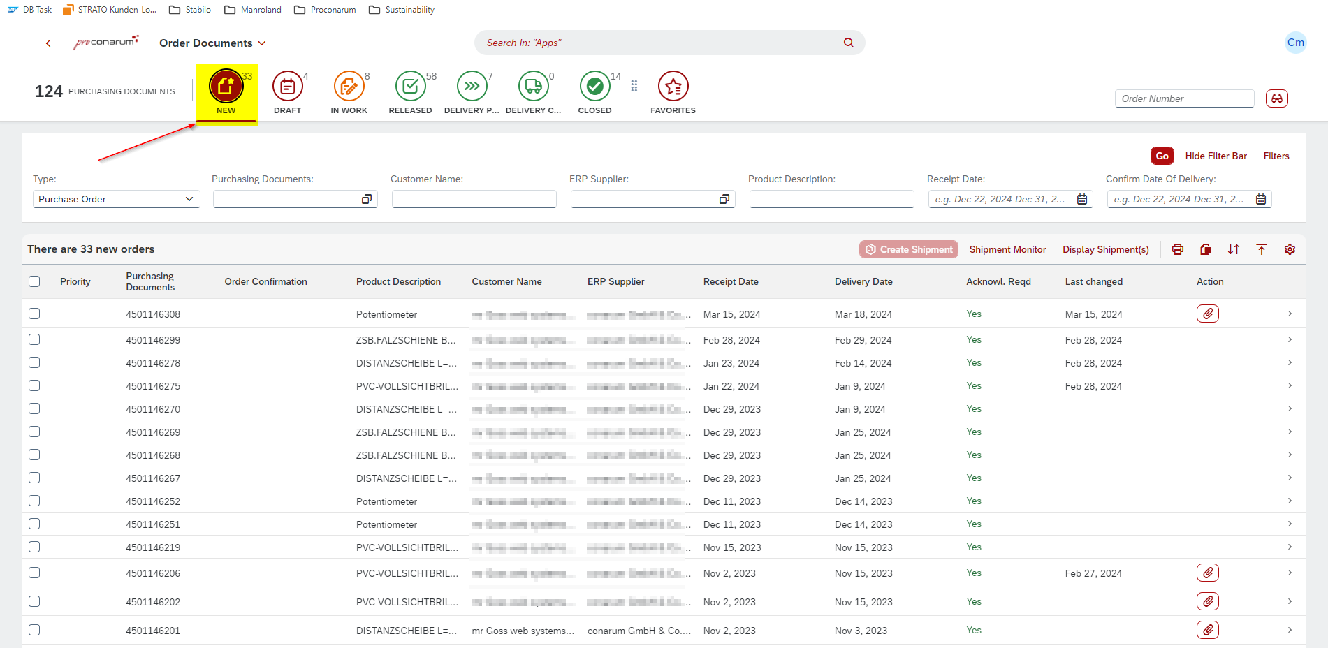 A new purchasing document is transferred to the proconarum platform. The status New is set and a mail is sent to the contact person of the supplier.
